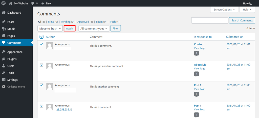 The Comments page on the WordPress admin panel, showing how delete all of the existing comments under every post or page