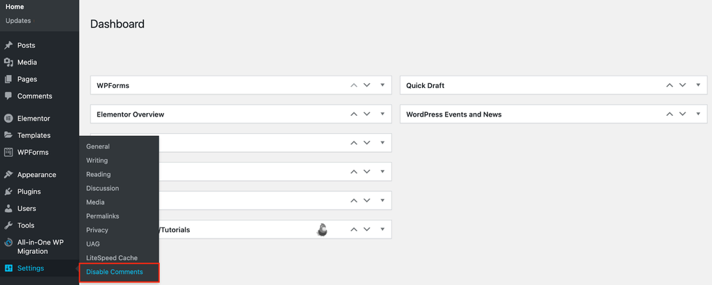 The Settings section on the WordPress admin panel, showing where to access the Disable Comments plugin