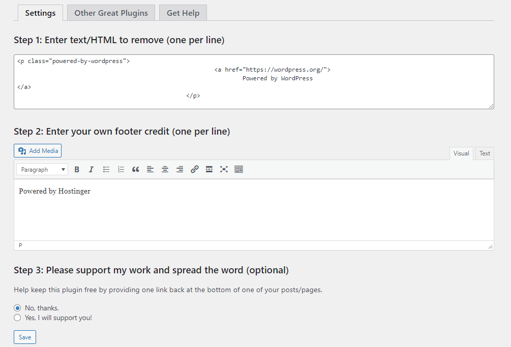 1. Navigate to WordPress Dashboard -> Tools -> Remove Footer Credit to access the Settings section. Paste the code snippet under Step 1 to remove the credit from your website’s footer. Click Save to finalize the changes.