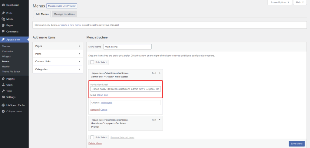 - Go to Appearance → Menus from your WordPress dashboard. Click on the menu item to expand the dropdown menu and paste the HTML code into the Navigation Label textbox before the text.