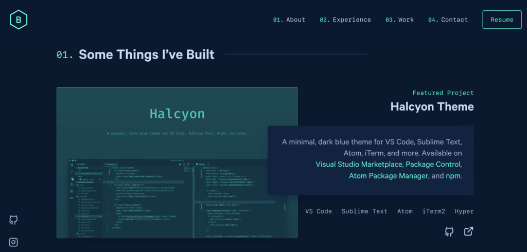 Take a look at this web developer portfolio website from Yevgeniy Brikman.