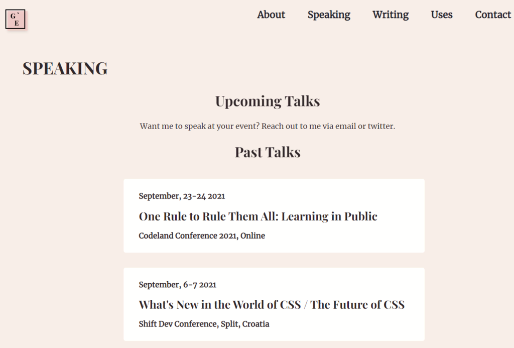 Gift showcases her expertise by exploring different platforms. Her portfolio website has a blog section, where she posts web development tutorials and career tips. She also shares her experience as a speaker in various tech events both on the site and on her YouTube channel.