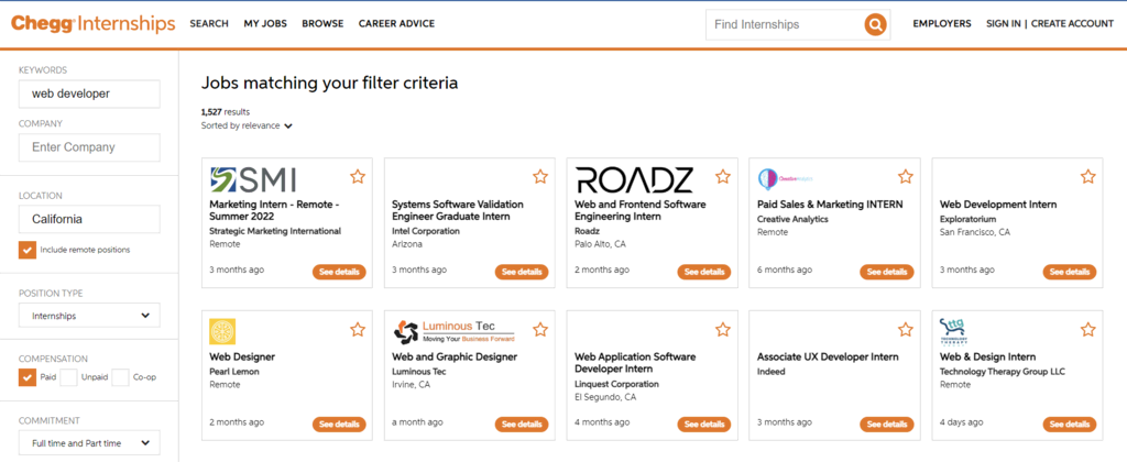 If you would like to gain experience in a corporate environment, look for internship opportunities on platforms like Chegg Internships. Simply type in the keyword “web development” and select your preferred location.