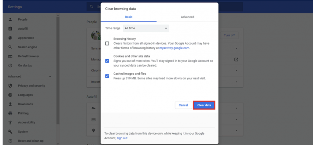 - Once the dialog box appears, tick the Cookies and other site data and Cached images and files options. Set the time range to All time, then click Clear data.