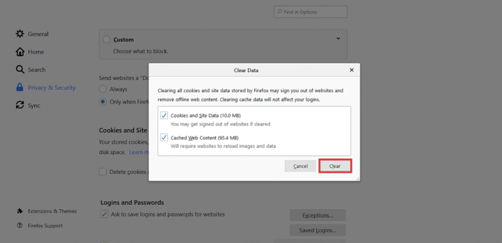 - Tick the Cookies and Site Data and Cached Web Content options, then click Clear.