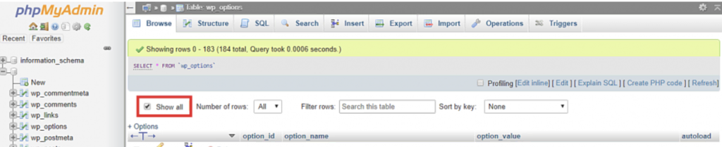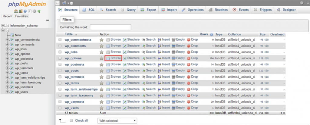 - Click Browse next to the wp_options table. Please note that the table’s prefix may vary.