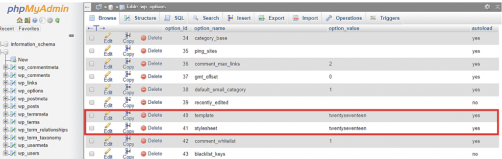 - Locate the template and stylesheet rows, then rename the values to twentyseventeen by double-clicking the current theme name.