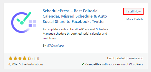 - From your WordPress dashboard, head to Plugins -> Add New and search for SchedulePress. Click Install Now and Activate to start using the plugin.