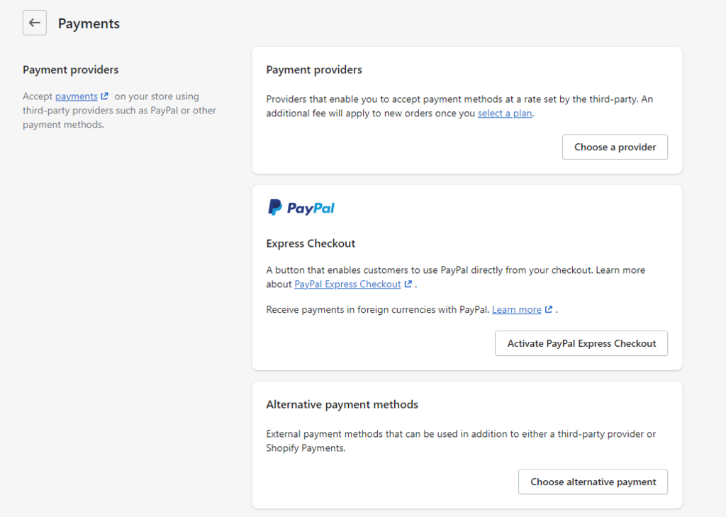 To receive payments in foreign currencies, use PayPal Express Checkout. Shopify gives an account with the email used to sign up for the platform. Simply head to Settings -> Payments -> Activate PayPal Express Checkout to use this feature.
