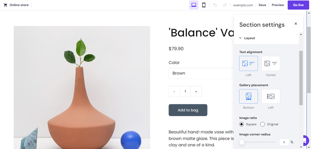On the website builder, it’s easy to customize the product page design for better conversions by changing the layout, text alignment, and button styles. Additionally, you can display the available product quantity so customers feel more inclined to purchase before items run out.