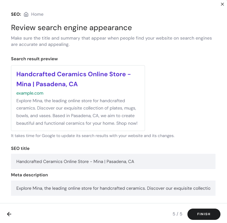 For meta titles and descriptions, the builder helps by suggesting keywords and automatically creating metadata based on existing website information.