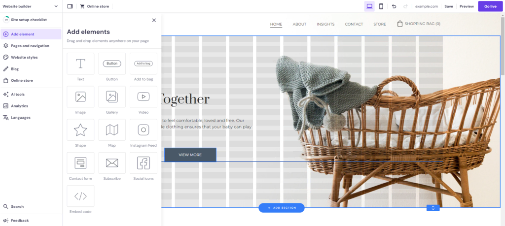 Hostinger’s builder offers the standard elements needed for a website, like text, images, and buttons.