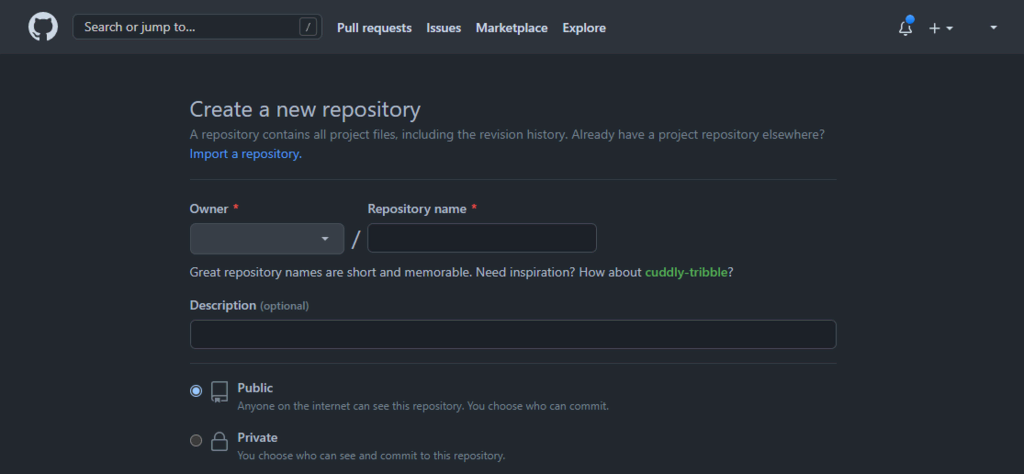 - On the Create a new repository page, select an Owner and enter your Repository name. Optionally, add a Description for your repository.