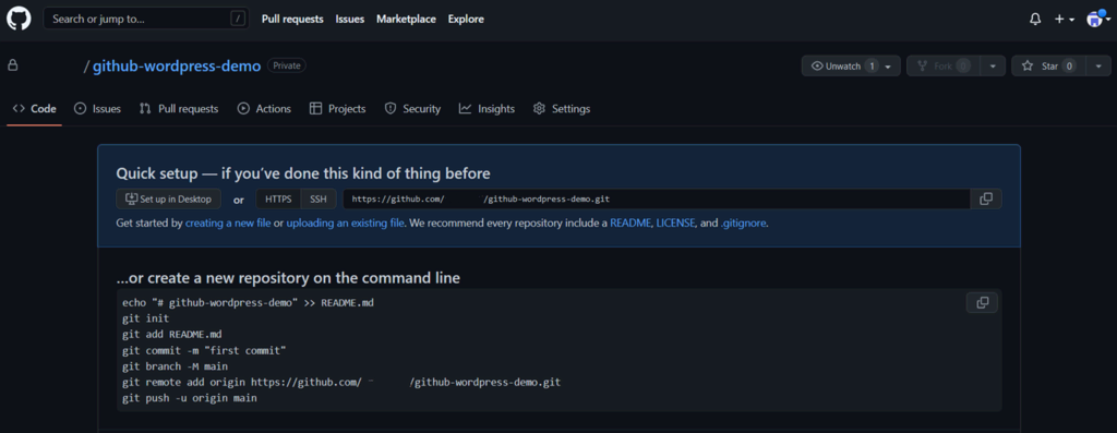 - Since we are pushing the local repository, skip Initialize this repository with: and click Create repository. Once created, GitHub will show your new empty repository.