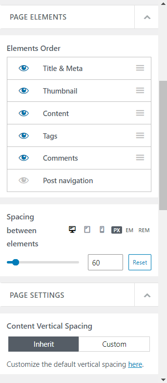 - In PAGE SETTINGS, set the Content Vertical Spacing option. Select Inherit for default theme settings or Custom to define your own.